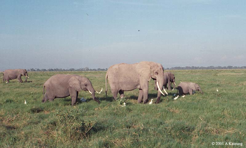 Mother elephant (center) with two different ages of young: older one (with tusks) at left, younger one (no tusks) at right. Amboseli Park in Kenya has one of the largest concentrations of elephants, even though it is one of the smaller parks. |