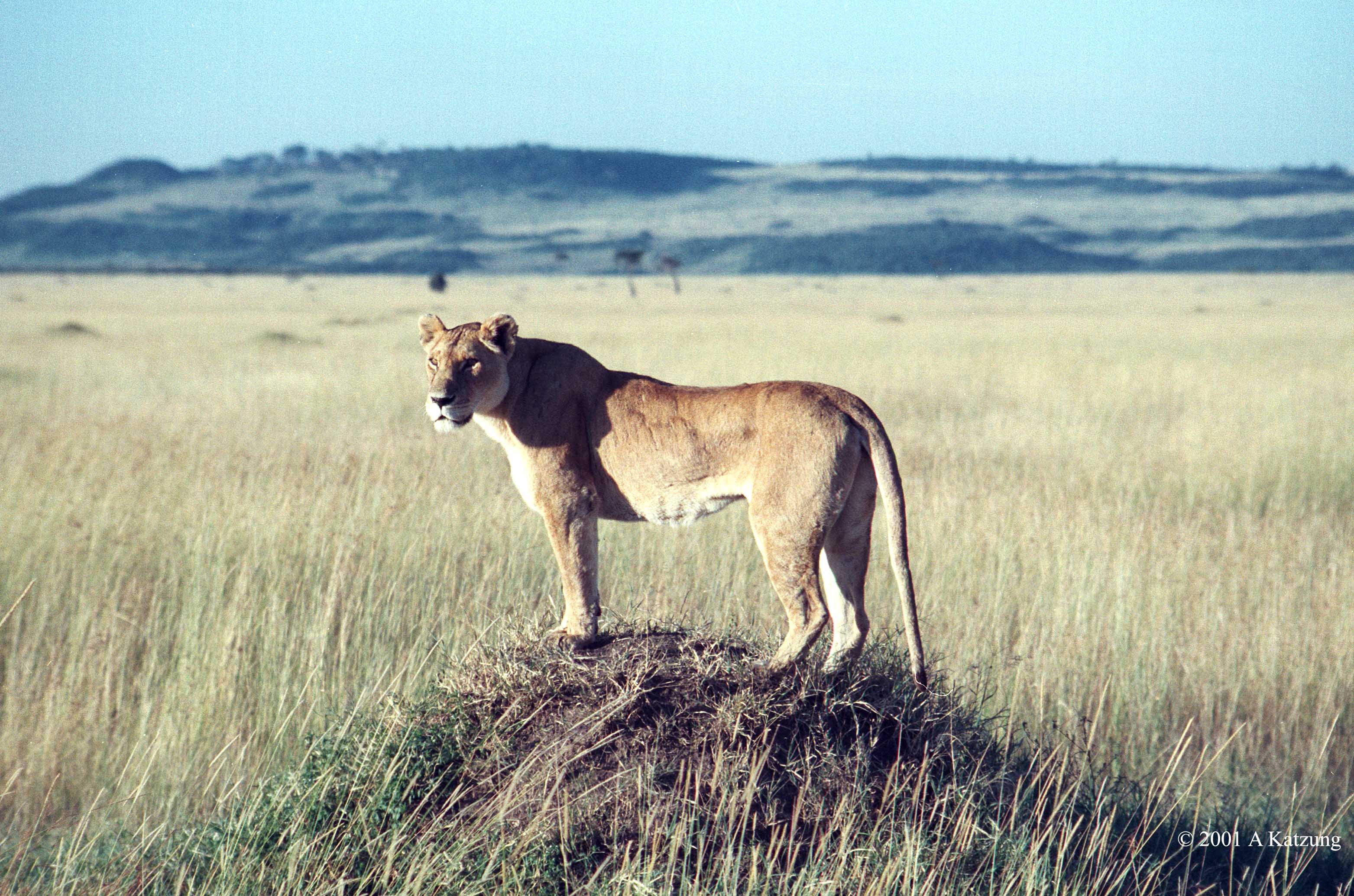 This lioness looks like she is wondering where the next meal is coming from. Old termite mounds, anthills, and dung-hills make good vantage points.