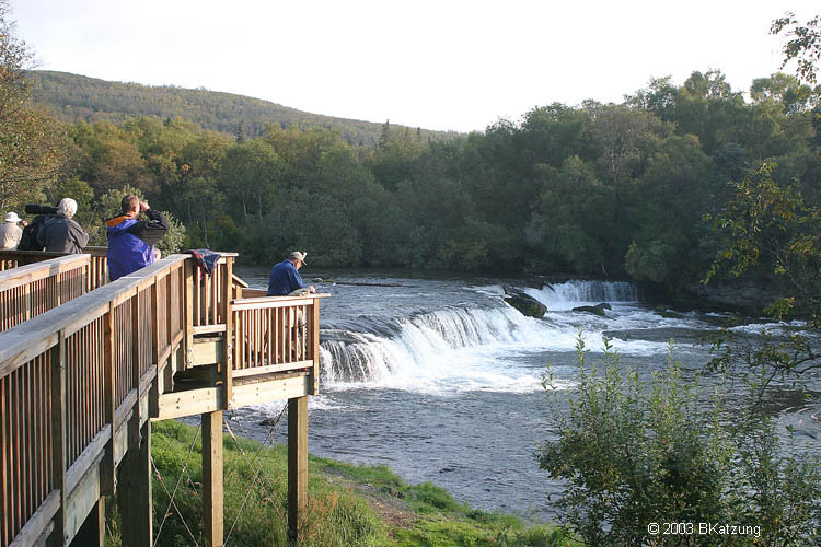 Here is Brooks Falls, where dozens of bears line up in July to catch the peak salmon migration upstream. There were still a few salmon trying to make it up the falls (but rarely succeeding). The park is well equipped with viewing platforms. Here is the one at the Falls:
