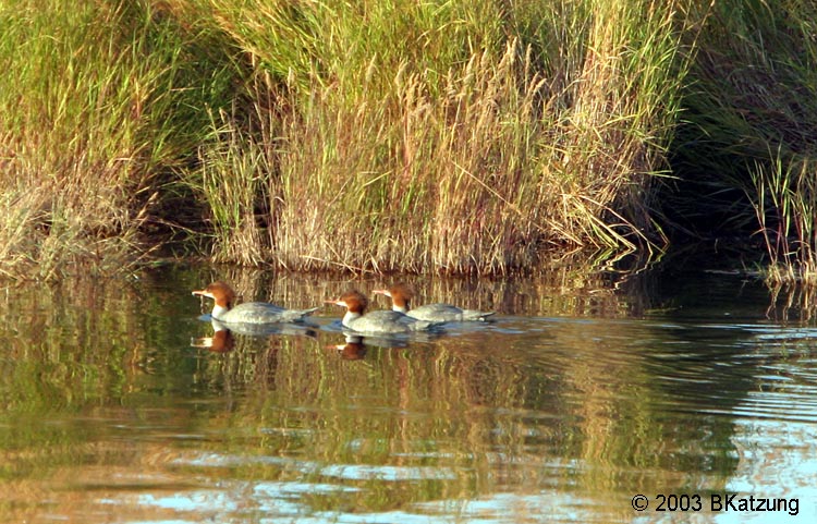 These are all female mergansers. Males have a dark-greenish head. These ducks are expert fish-catchers and have a serrated and hooked beak for holding on to slippery fish. Back to Alaska Page Back to Birds Page