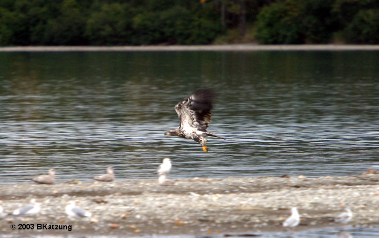 "Our" resident immature bald eagle spent a lot of time sitting on a small downed tree on the sand bar in front of the beach and relatively little time flying. When he did take off, I shot as many frames as I could but most were not good enough to display. This is one of the better ones. Back to Home Page |