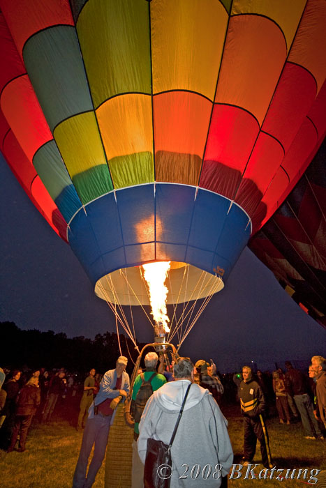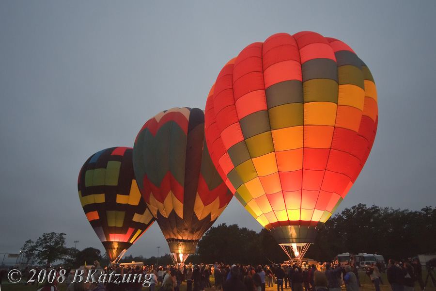On June 28, 2008, Alice and I visited the Balloon Festival in Windsor, Sonoma County, California. This is an early morning affair, with the inflation of the three Dawn Patrol balloons scheduled to begin at 4 AM and lift-off (if it occurs) at 5:50. It turned out to be a foggy morning with poor visibility, so there was no lift-off, However, the inflation of the balloons and the colors achieved by increasing the propane flames of the hot air heaters, made it an interesting and colorful photo-op. Several images, please scroll down.