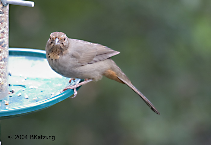 These are uncommon in our neighborhood in Northern California, but the west side of California and Baja California are the only habitats for this rather plain bird (according to Sibley's Guide to Birds). They are much larger than the juncos, chickadees, and titmice that are the far more common visitors to our feeder and almost the size of robins. Image captured in February 2004 with a Canon 10D camera with 100-400 mm zoom lens.