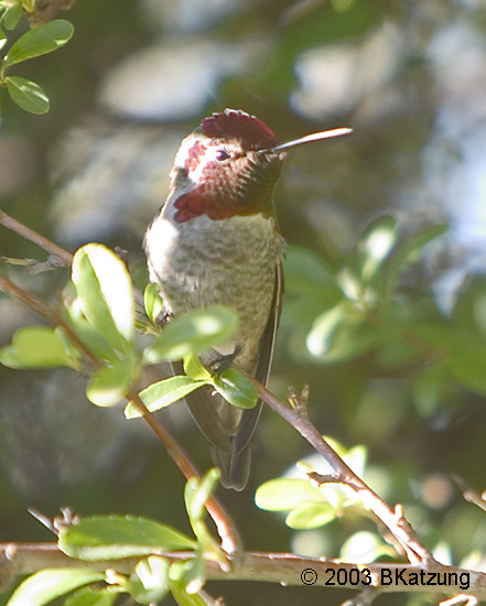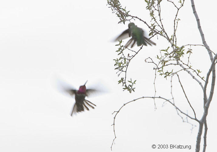 Anna's hummingbirds are very common in Northern California and are very fond of a free lunch in the form of sugar water. A single feeder will often attract several birds, but they are quite territorial and usually one dominant bird will try to drive all others away from the feeder. In the Spring, there are so many nectar-rich blossoms available for feeding that no bird goes hungry. This one was photographed near the feeder around 3PM in mid-March, 2001, on Kodak Supra 100 film with a Nikon F100 and Micro-Nikkor 105 mm lens. Shutter speed was 1/1000 second, aperture unrecorded. The total body length of this bird is about 2.5 inches (6.5 cm) so you have to get fairly close or use a long lens (or both) to get adequate image size. Scroll down for additional hummingbird images. The following images were taken in Arizona with a Canon 10D digital camera in November 2003. The lens was a Canon 70-200 mm L IS zoom at 200mm plus a 1.4x extender.
