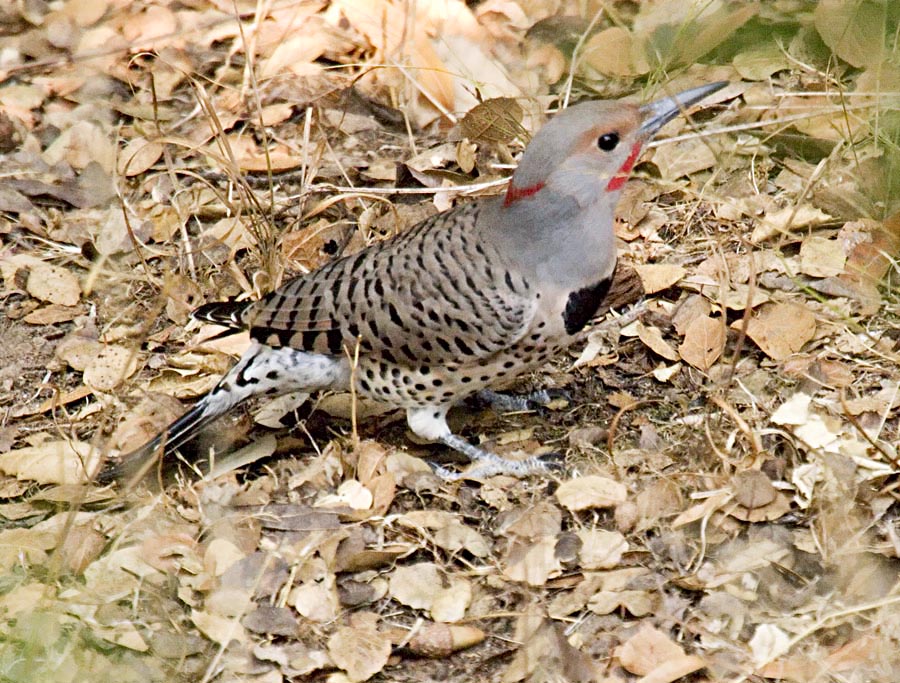 The flicker is a member of the woodpecker family, thus a fairly large bird. Our gilded flickers are very handsome as shown by this beautiful bird. Note that he appears to have lost the salmon-striped wing primary on the right side. These images were taken on October 12, 2004, with my Canon 10D, a 100-400 mm image stabilized zoom lens at 400 mm, plus a 1.4x extender for a total focal length of 560 mm. Incorporating the 1.6x cropping factor of the CMOS sensor in the camera, this works out to almost 900 mm equivalent 35 mm camera focal length. Because our yard is generally quite shady, I boosted the ISO speed to 400.