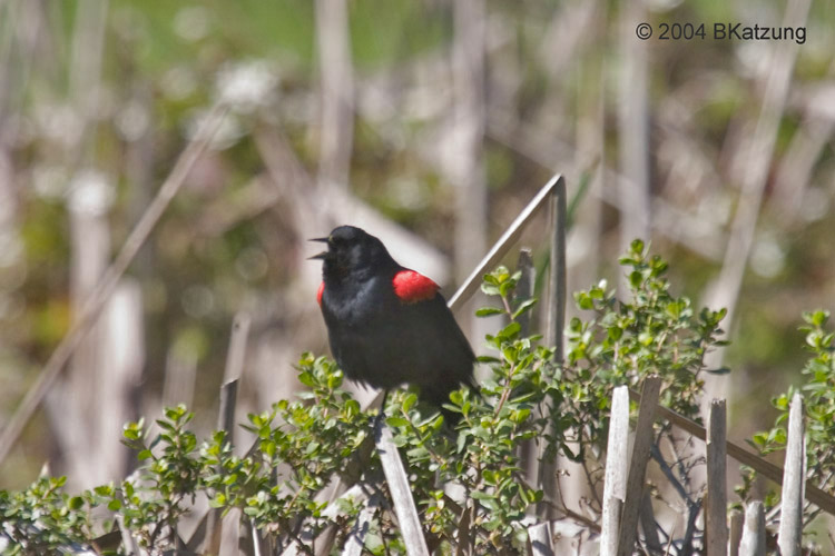 Red-winged blackbird males sit on reeds in marshy areas making their territorial claims as loudly as they can. There were a couple of them in these cattails at Audubon Canyon Ranch in Marin County, California when I saw them on 28 March, 2004. Image captured with a Canon 10D camera and 100-400 mm L IS lens plus 2x tele-extender at 600 mm focal length.