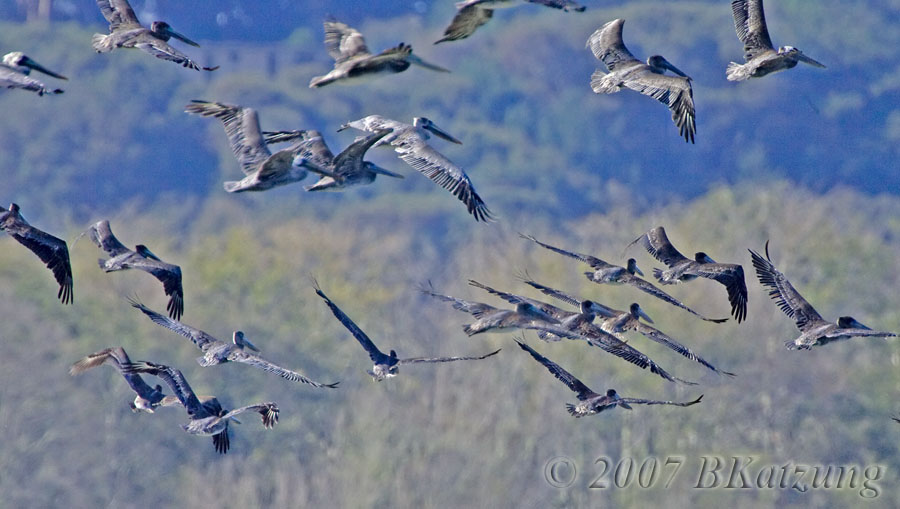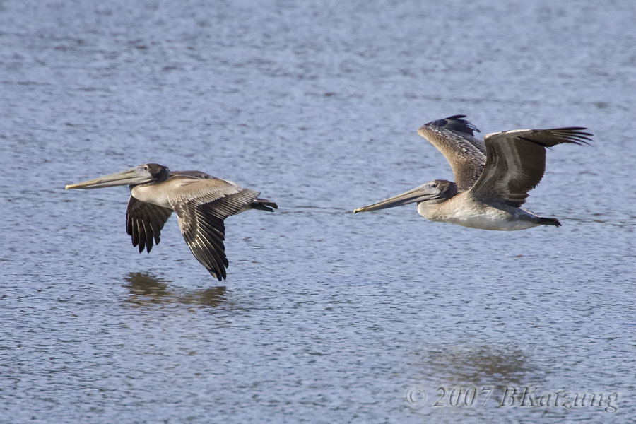 Above, part of a large flock taking off from the far side of the lagoon. Below, two pelicans flying by from one part of the lagoon to another.