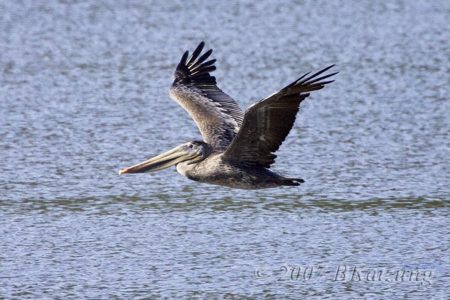Below, a single pelican cropped out of a larger group. Most of these birds are immatures and none are in breeding plumage. Breeding colors usually appear around December.