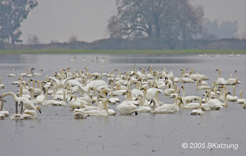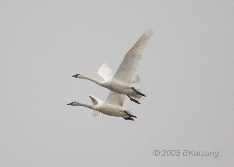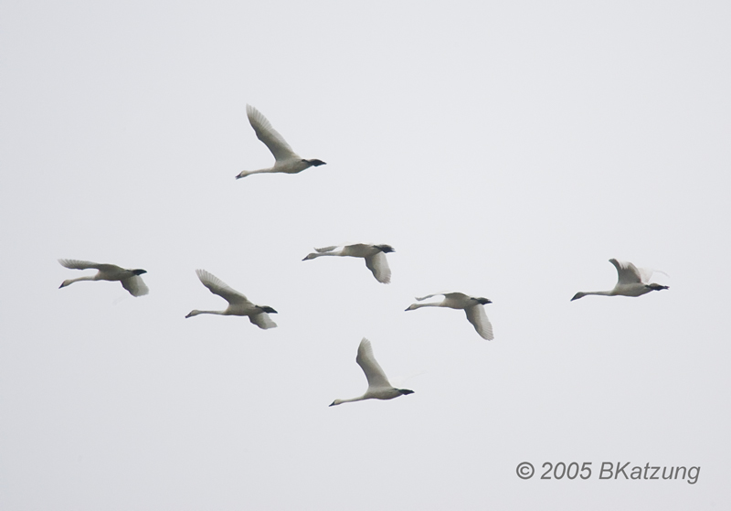 If seen together, the difference between tundra swans and snow geese is quite obvious: swans have black beaks and longer necks, as well as being considerably larger. When seen apart, one has to depend on the black beak and the longer neck for identification. The young swans have gray necks (see left foreground).