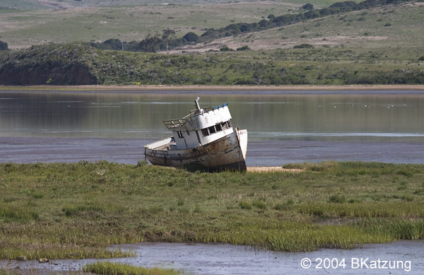 Above: Gulls at Drakes Beach. Below: An abandoned boat (The "Point Reyes") at Inverness.