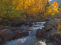 Fall Color In The Sierra All of these images except the first one (Shed in the Aspens) were taken between October 6 and 10, 2004, in areas on the east side of California's Sierra Nevada. US Route 395 follows the east slope of the Sierra and we drove over Sonora Pass on route 108 to reach 395. From there we drove southward to Bishop, making short trips to several areas with major aspen groves as described in http://www.calphoto.com/fall.htm. We found a very helpful map to the 395 corridor called "Eastern High Sierra Fall Color Guide" in the MountainLight Gallery in Bishop. It covers all the major color points on 395 from Walker River in the north down to Big Pine in the south. It lists the Bishop visitors' bureau (888-395-3952), Mammoth Lakes visitors' bureau (888-GO-MAMMOTH), and Mono County (800-845-7922) as sources. It's worth a phone call to obtain one of these maps before you go! The images were captured with a Canon 10D camera and several Canon lenses plus a Sigma 12-24 mm zoom for wide angle shots. (The first image was taken in 1974, in the Lake Tahoe area near the Northstar resort using film and Nikon equipment.)
