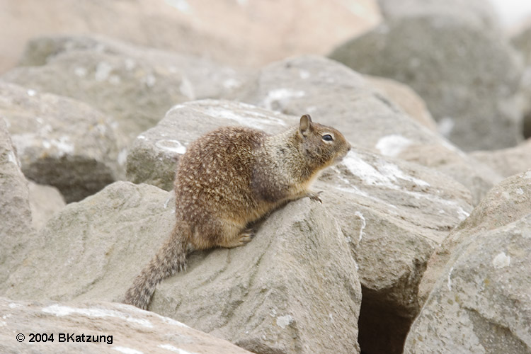 The California ground squirrel is extremely common in central California around San Luis Obispo County. In fact, this was the most common form of road kill we saw as we drove the back roads around Lake San Antonio in February 2004. This particular citizen was spotted on the the rocks at the side of the harbor at Morro Bay on the coast. California ground squirrels are 14 to 19 inches long, one-third to one-half of which is tail. Unfortunately, when startled they instinctively run for their home burrow hole rather than the nearest one. For those living on roadsides (a preferred habitat for some reason), running for the home burrow may be fatal. This image was made in dim morning light at 260 mm focal length with a Canon 100-400 mm L IS lens at f/5.6 and 1/20 sec exposure using an ISO speed of 200. The value of image stabilization is clear!