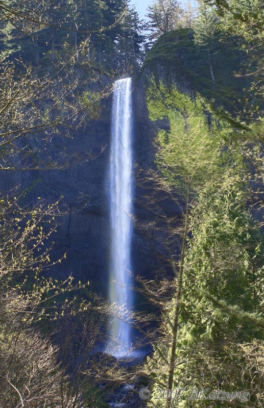 Multnomah Falls Imaged with my Sigma 12-24mm wide-angle at 15 mm. This is an 4-frame HDR image (PS CS2 version) and the people on the bridge have been erased by the HDR procedure. The north-facing orientation of most of the falls emptying into the Columbia prevents much light from falling on the water.