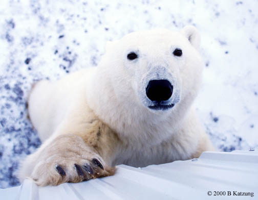 These bears are very curious and would love to get up on the viewing platform with us. In fact, biologists sometimes interact with bears down at ground level and few attacks have occurred. Polar bears seem to be somewhat less aggressive than grizzlies even though they are a bit larger than grizzlies. Evolutionarily, polar bears are a very new species, and are believed to have split off from the brown bear (grizzly) only 40 or 50 thousand years ago. According to some sources, the species split is not yet complete because interbreeding, with fertile offspring, still occurs. That right front foot, by the way, is about 12 inches long by 8 inches wide and the claws are about 2 inches long.
