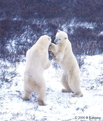 Sparring 2 These 600-800 pound males have no trouble walking on two legs. They prefer four for running, but for boxing and wrestling, they like to have the forepaws available for swatting the other guy! |
