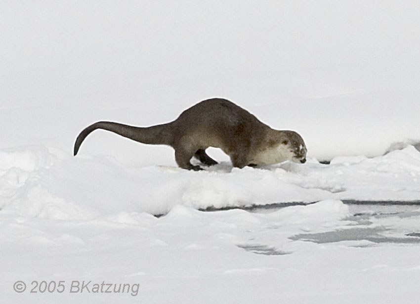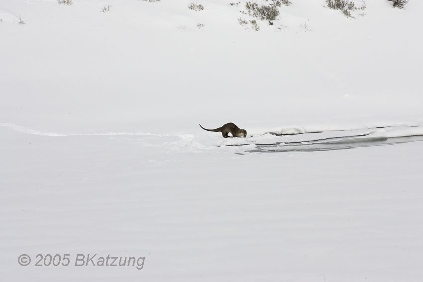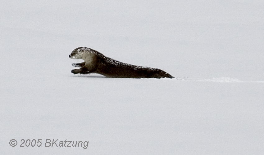 Below: the otter decides to take a long trip and his method in this deep snow resembles the swimming of a porpoise or dolphin.