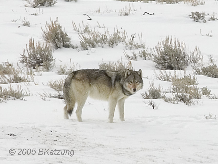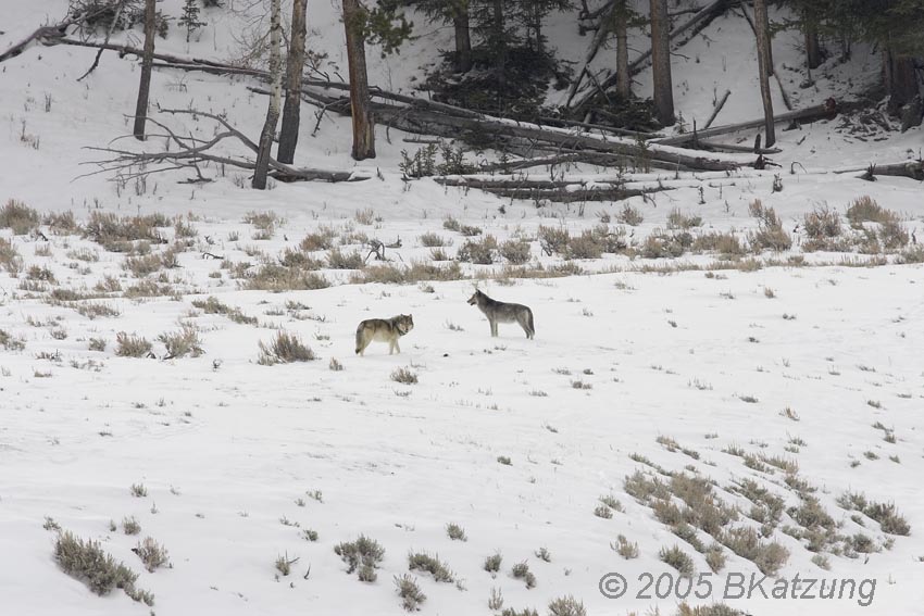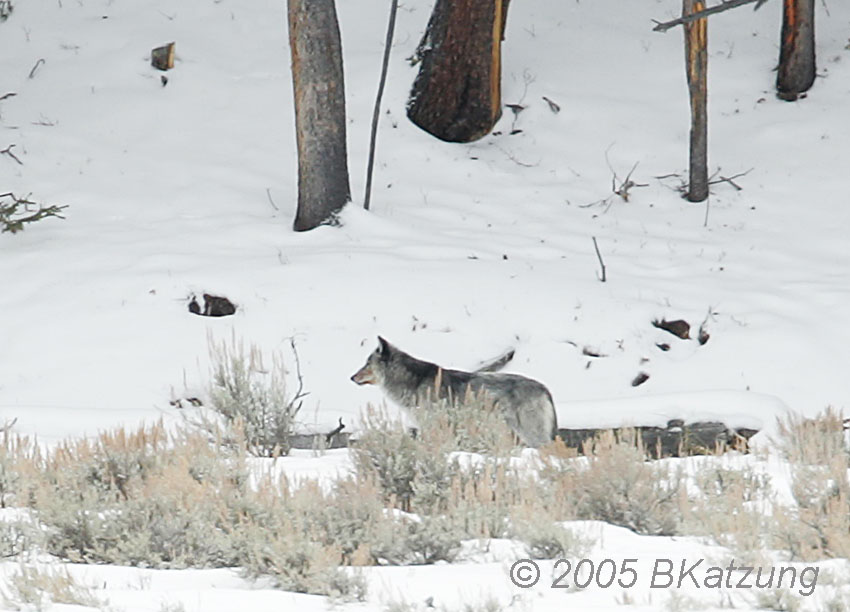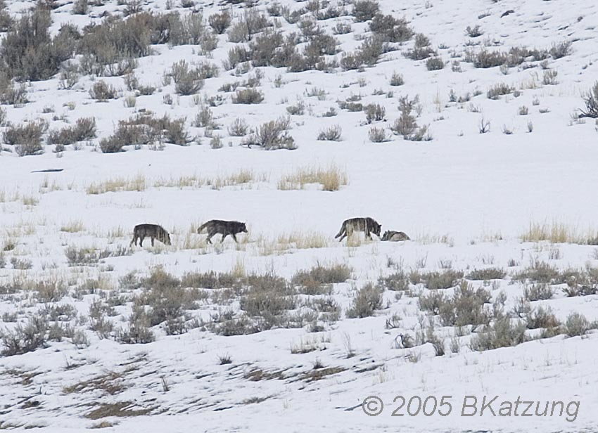 The above image was taken in a snowstorm. An elk carcass lies in the gulley at the right. The wolves are members of the Slough Creek Pack, 2005. Note ravens in the middle tree and on the ground.