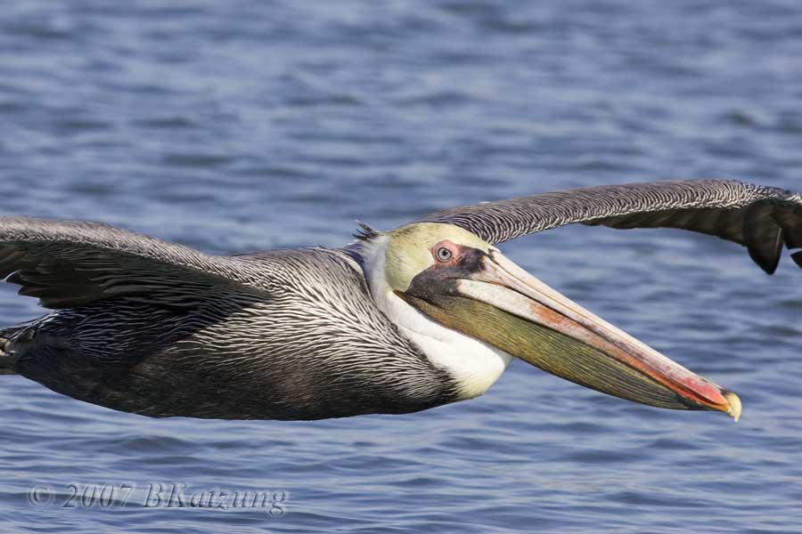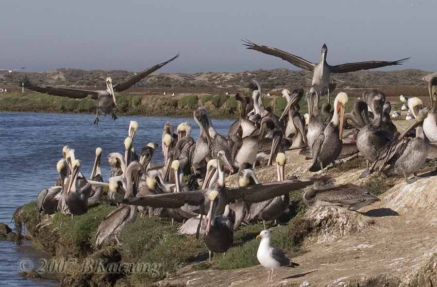Brown Pelicans at Elkhorn Slough Brown pelicans are far more numerous than the larger white pelicans at Elkhorn. We saw only a few feeding, since the tours took place between 9AM and 12 and between 2 and 4PM, whereas prime feeding times are earlier in the AM and later in the PM when the fish are closer to the surface. Nevertheless, some of the pelicans spent a lot of time flying around, so we got many flight shots.