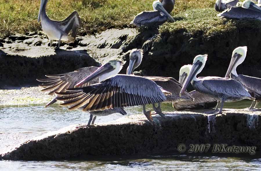 Below, three pelicans. The middle one, with the red gular pouch under his beak, is a male getting his breeding colors.