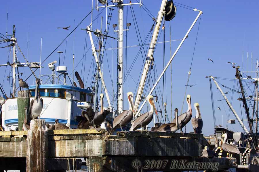 Below, a group of pelicans sittin' by the dock o' the bay.