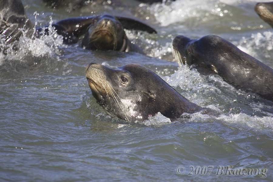 A raft of sea lions churning up the water. The small external ear (one of the distinguishing features of sea lions as opposed to seals) can be seen here and more clearly in the image below this one.