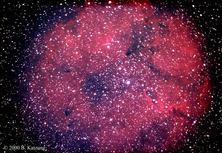 IC1396 is a very large emission nebula in Cepheus. It's about 135 x 165 arcminutes (too large, in fact, to fit on a 35 mm frame at 585 mm focal length). This single shot was obtained on a very windy night with poor alignment and tracking, as evidenced by the oval stars in the upper corners of the image. This is definitely not a keeper but a place-holder until I can photograph it under better conditions and more carefully. A more recent CCD image in hydrogen alpha light can be seen here. A still more recent CCD RRGB image can be seen here.