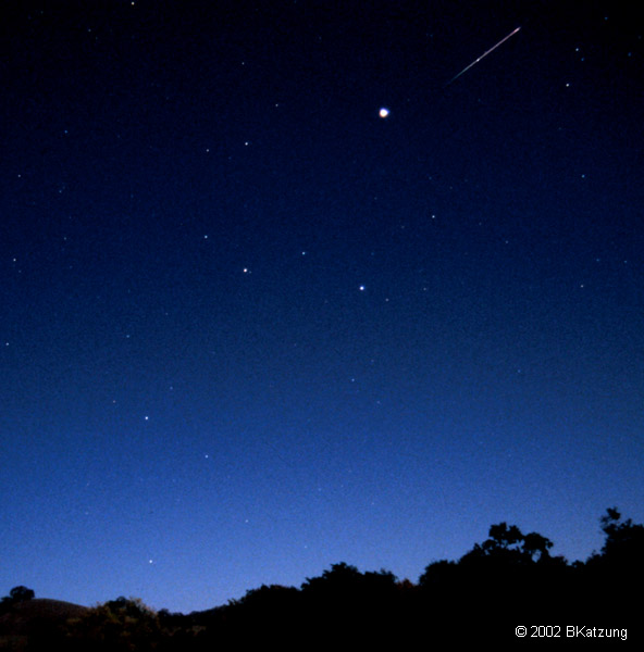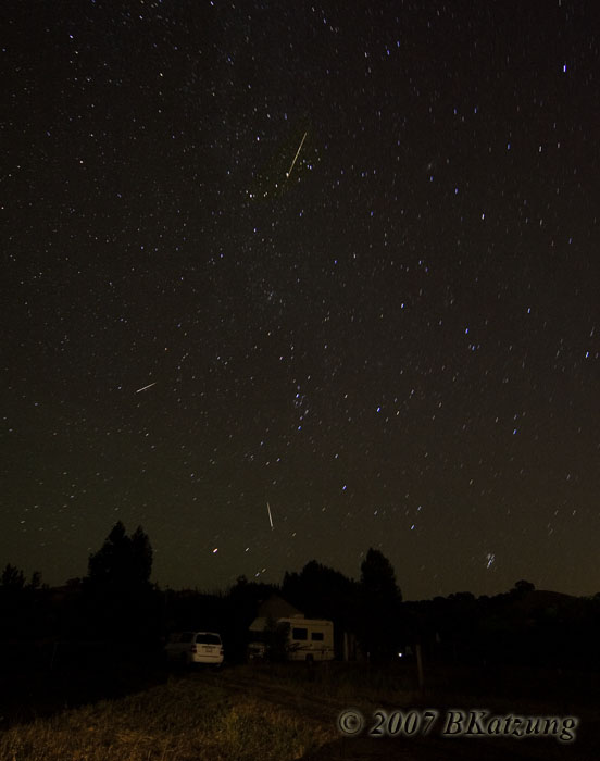 Below, a composite with 3 Perseid meteors from August, 2007. The two lower meteors were captured in a single frame, the upper one was captured on a separate frame and superimposed by aligning the nearby stars.