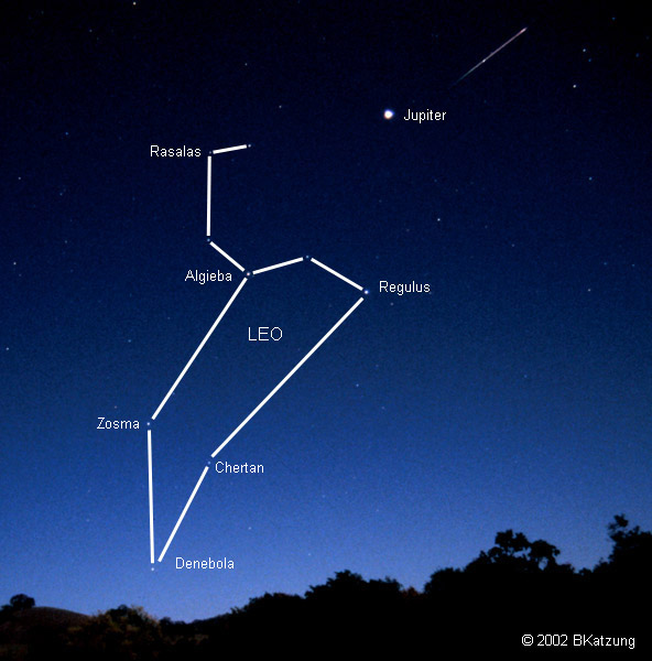 Meteors Meteors are much easier to see than to photograph. I have attempted to image meteors for several years and average one or two recognizable meteors for every 100 to 200 frames shot. Since they are so brief (and my reaction time is not the fastest), I have never tried to open the shutter when I saw a meteor flash by; I simply set the interval timer remote control (Canon TC80-N3) and let it take 1 or 2 minute exposures sequentially for most of the night. This is too much for even the Canon 1D battery, so I use the AC adapter to provide power. I also usually find dew accumulating on the lens after several hours in the cool night air, so I either warm the lens periodically with a small hairdryer or use a lens-warmer strip called a dew-zapper. These consist of a strip of resistance wire in a soft velcro band, supplied with low voltage DC current. Several images, please scroll down. A Leonid meteor from 2002, the frame below it provides labels and the outline of the constellation :