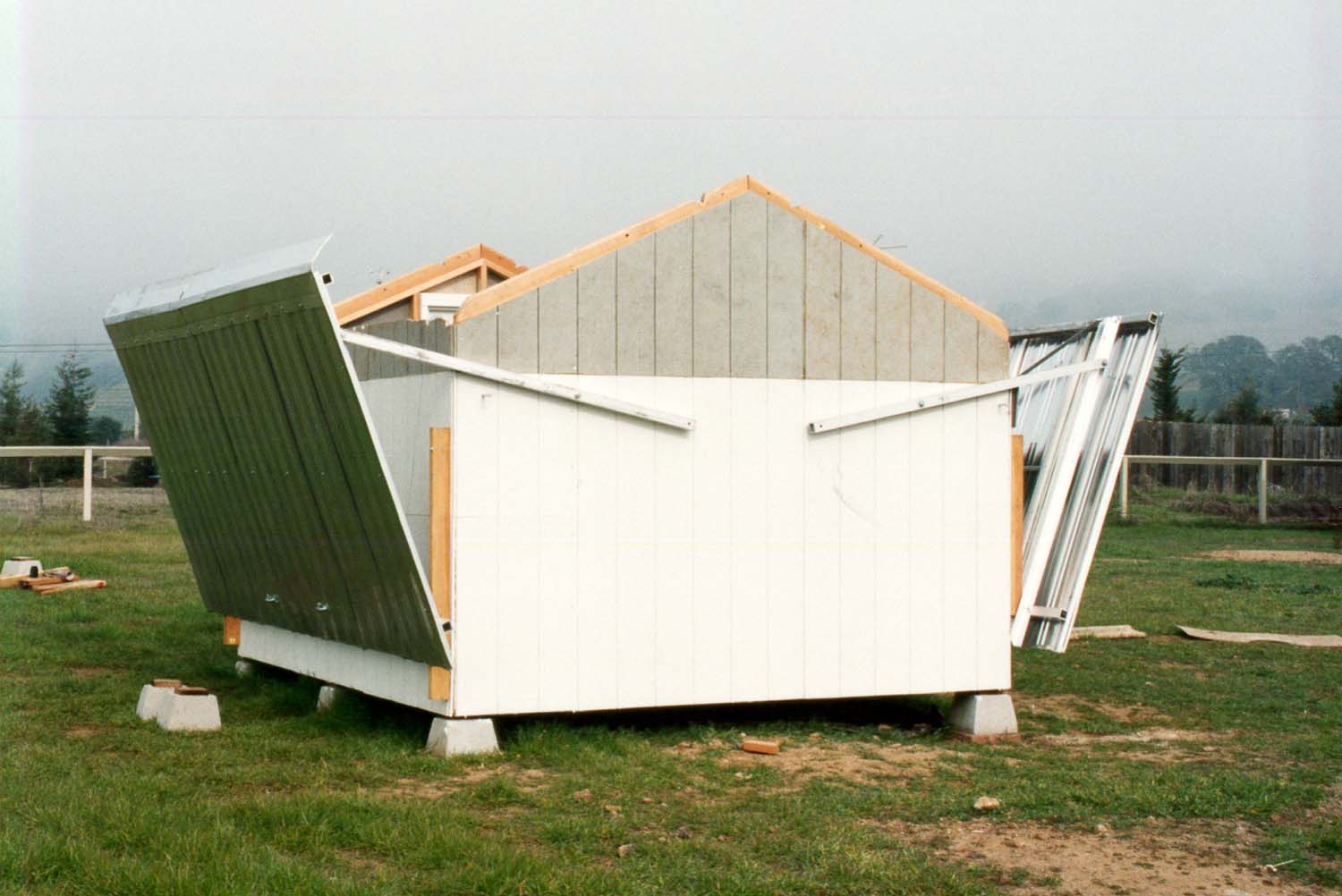 Trying it out. It's been "almost finished" now since 1998. The figures show the completed observatory, open and closed. I've used it regularly and have no major problems with any aspect. There is a lot of airflow under the eaves preventing too much heat build-up, even on 100-degree days, but it remains surprisingly dry even during heavy rains. Dust does blow in,