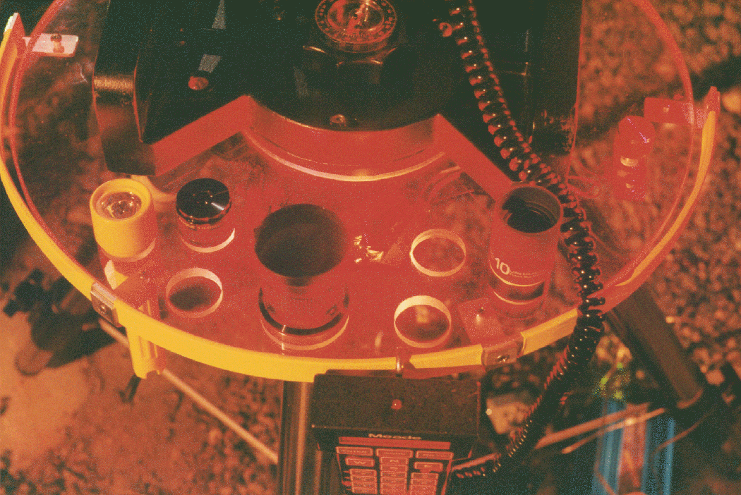 The holder is cut from a piece of 3/8 inch acrylic (Plexiglas). I had the supplier (a local plastic retailer) cut the outer and inner circles. The inner cutout is large enough to fit loosely over the tripod top so the holder is supported by the tops of the legs of the tripod. There is enough space so that the 3/8-thick holder just fits between the tops of the legs and the bottom of the scope or wedge. I then cut the notch in the inner circle to accommodate the wedge azimuth adjuster, and the eyepiece holes. The yellow rim around the front is a piece of 5/8 x 1/8 aluminum with yellow shrink-wrap electrical tubing shrunk tightly onto it. It is held on to the plastic with 4 radially oriented brackets drilled and tapped so that the rim is held about 1/4 inch from the edge of the plastic. The rim is used for hanging the hand control of the scope (you can see the top of the control in the right picture hanging down in front). Two small bulbs (RadioShack) are mounted in the plastic and powered from the 12 volt battery that I also use for powering the scope and dew zappers. These bulbs are located under the black spots (tape) visible in the red spots (also tape) in the left picture. The wires from the bulbs go to a small potentiometer (silver-colored knob at the right side of the holder in the left picture). The pot permits one to adjust the brightness to just enough to make the edges of the eyepiece holes glow in the dark.