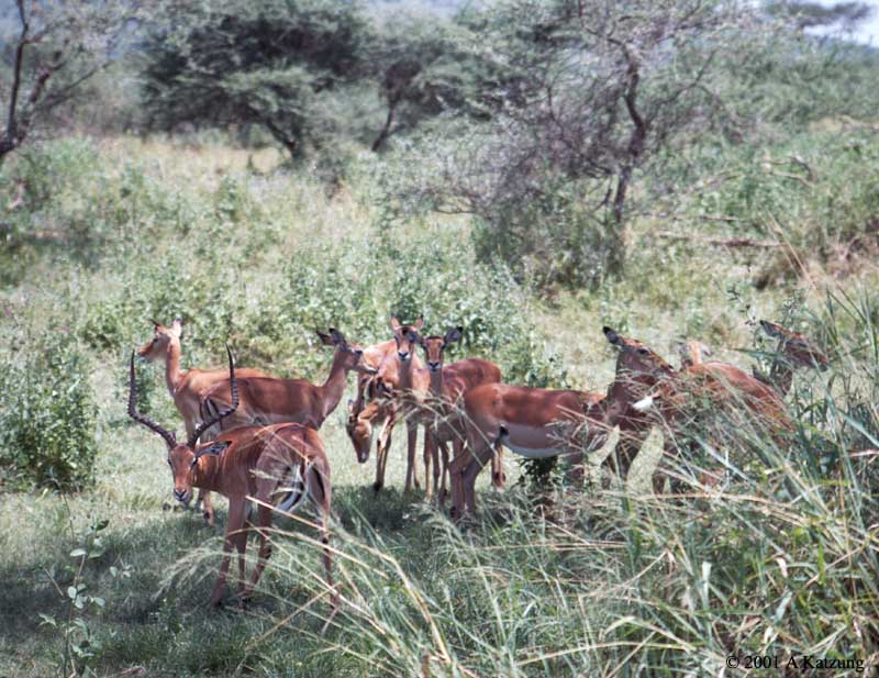 The long-horned buck at the left is looking suspiciously back at us: there were four bachelor bucks waiting nearby to take advantage of any loss of concentration on the part of this buck. Although they appear very fast, impala are actually not the best runners of the African plains. They are excellent jumpers, however, and when surprised, a herd jumps in all directions, thereby confusing any would-be predator. |