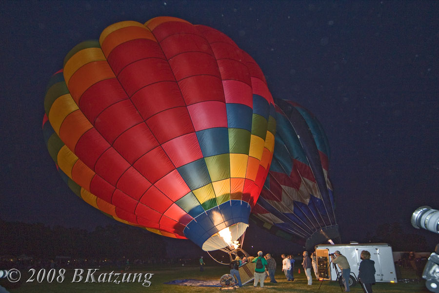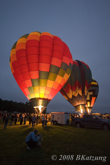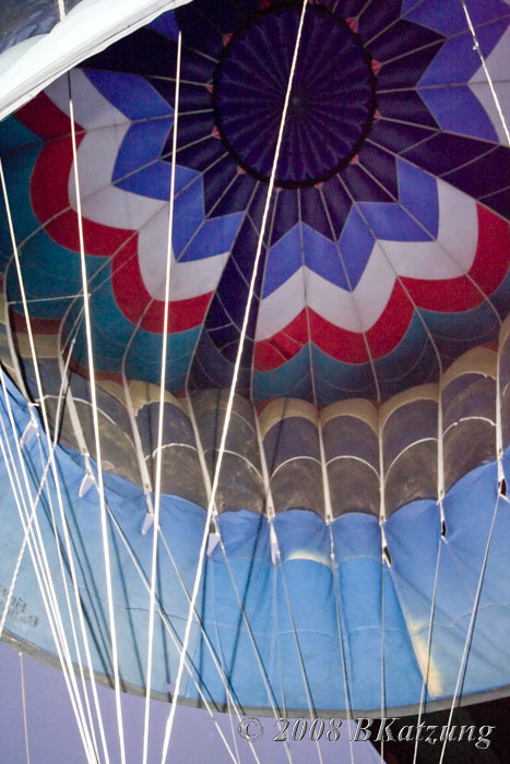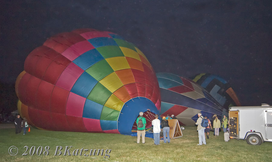 On June 28, 2008, Alice and I visited the Balloon Festival in Windsor, Sonoma County, California. This is an early morning affair, with the inflation of the three Dawn Patrol balloons scheduled to begin at 4 AM and lift-off (if it occurs) at 5:50. It turned out to be a foggy morning with poor visibility, so there was no lift-off, However, the inflation of the balloons and the colors achieved by increasing the propane flames of the hot air heaters, made it an interesting and colorful photo-op. Several images, please scroll down.