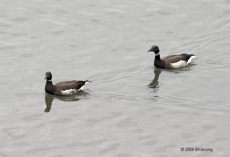 Brant, unlike Canada geese, are located almost exclusively along the coasts of North America but according to Sibley, are "rare visitors inland." Morro Bay Estuary claims to be the only significant site for this species in California and many were present when we visited in February 2004. They swam in convoys of 2 to 8 or more in the shallow water of the estuary.