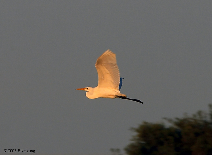Clearly a Great Egret (from his yellow beak and black feet), this is one of our residents of the Corte Madera lagoon in the San Francisco Bay area. Another, closer-up image of a Great Egret here. This image was captured July 18, 2003 with a Canon 10D digital camera and Canon 70-200 f/2.8L IS lens. ISO speed was set at 200.