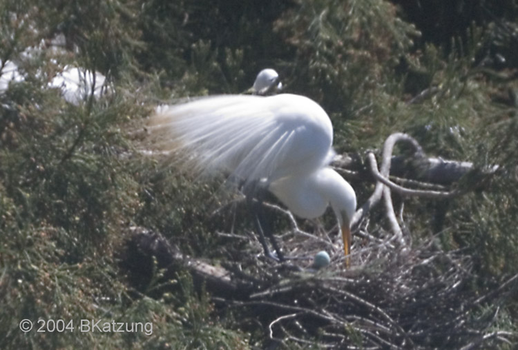 Another egret at the Corte Madera marsh in Marin County, California. Just coming in for a landing. Image taken with a Canon 10D digital camera and the Canon 70-200 f/2.8 L IS lens with a 1.4x Canon extender. 2003-August-07. Below, an egret turning her egg in the nest at Audubon Canyon Ranch at Bolinas, California. Image captured on 28 March, 2004 with the Canon 10D on a Meade ETX90 telescope (1250 mm focal length, f15) and heavily cropped.