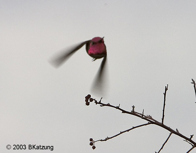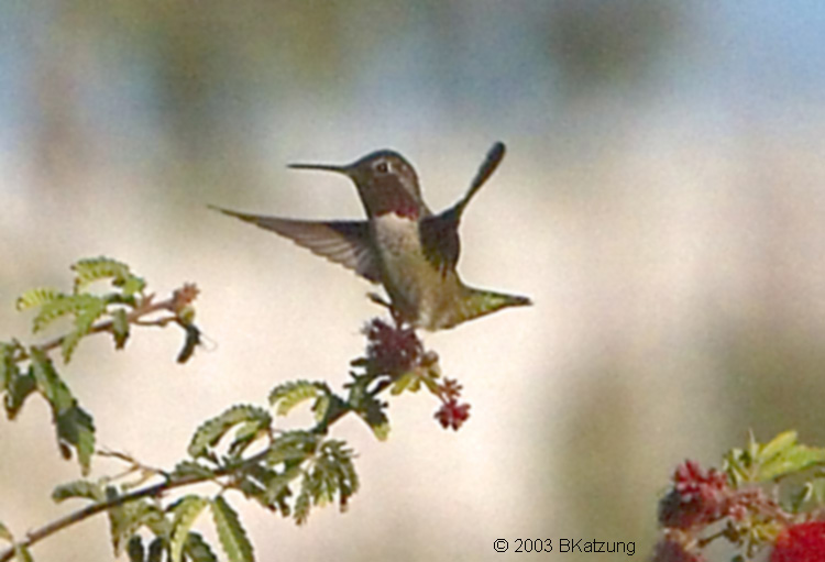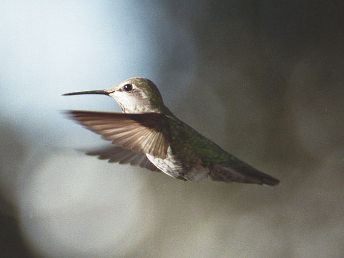 Anna's hummingbirds are very common in Northern California and are very fond of a free lunch in the form of sugar water. A single feeder will often attract several birds, but they are quite territorial and usually one dominant bird will try to drive all others away from the feeder. In the Spring, there are so many nectar-rich blossoms available for feeding that no bird goes hungry. This one was photographed near the feeder around 3PM in mid-March, 2001, on Kodak Supra 100 film with a Nikon F100 and Micro-Nikkor 105 mm lens. Shutter speed was 1/1000 second, aperture unrecorded. The total body length of this bird is about 2.5 inches (6.5 cm) so you have to get fairly close or use a long lens (or both) to get adequate image size. Scroll down for additional hummingbird images. The following images were taken in Arizona with a Canon 10D digital camera in November 2003. The lens was a Canon 70-200 mm L IS zoom at 200mm plus a 1.4x extender.