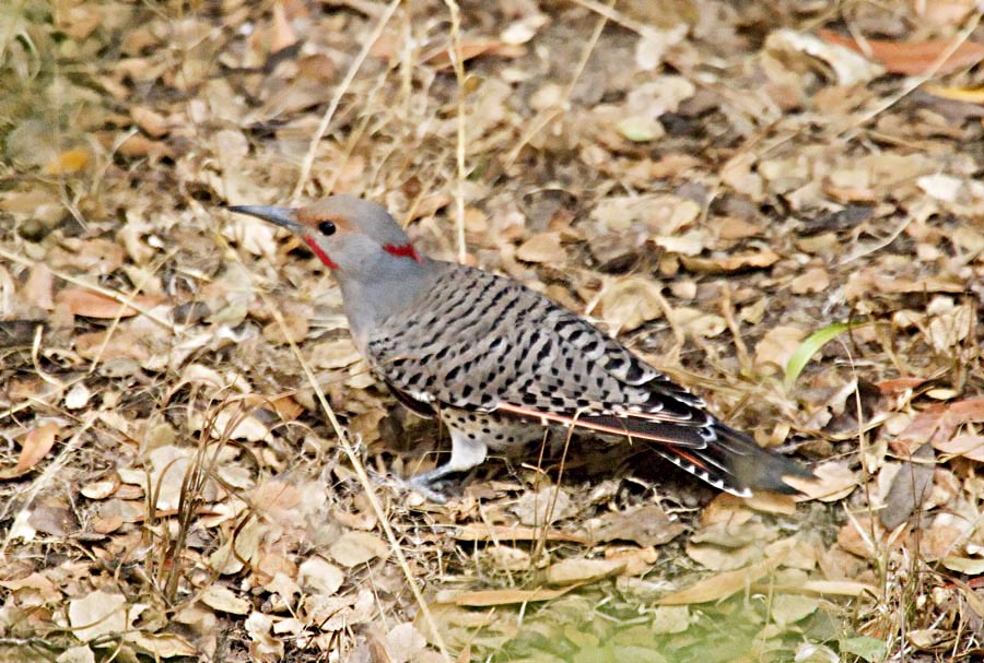 The flicker is a member of the woodpecker family, thus a fairly large bird. Our gilded flickers are very handsome as shown by this beautiful bird. Note that he appears to have lost the salmon-striped wing primary on the right side. These images were taken on October 12, 2004, with my Canon 10D, a 100-400 mm image stabilized zoom lens at 400 mm, plus a 1.4x extender for a total focal length of 560 mm. Incorporating the 1.6x cropping factor of the CMOS sensor in the camera, this works out to almost 900 mm equivalent 35 mm camera focal length. Because our yard is generally quite shady, I boosted the ISO speed to 400.