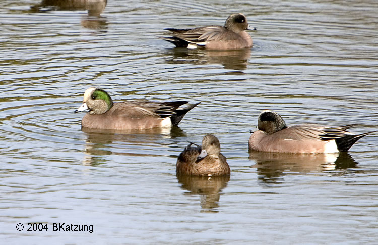 The chaps with the white strip over the top of the head and the green iridescent stripe over the side of the head are the widgeons. You don't see the green iridescence on all of the males because the light isn't reflecting just right, but the fellow on the left shows it nicely. Imaged at Corte Madera Town Center on 2004-01-25 with a Canon 10D and a Canon 70-200 lens with a 2x extender.