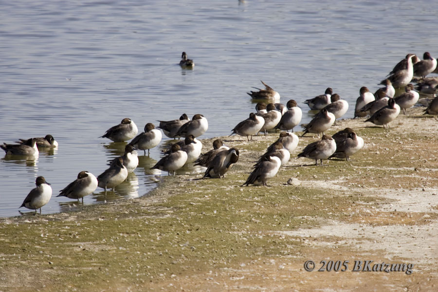 Northern Pintail (Anas acuta) On my return to the Las Gallinas Sanitary Ponds on 17 October 2005, I found very large numbers of Northern Pintails, a kind of duck I had not seen here before. The lack of really long feathers in the tail of these ducks is apparently a seasonal phenomenon. An image of a northern pintail in eclipse plumage is HERE. Two images, please scroll down.