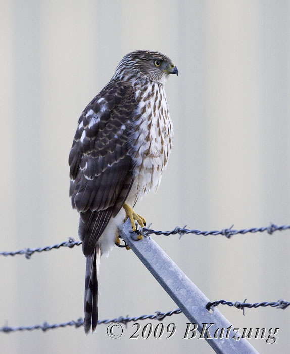 Juvenile Red-tailed or Red-shouldered Hawk Lots of fine dining for predators at the Ponds and the surrounding fields. Just before reaching the public parking area, I spotted this hawk on the fence. 500 mm f/4 on the 1Dmk2. He waited for me to get out of the car before flying off.