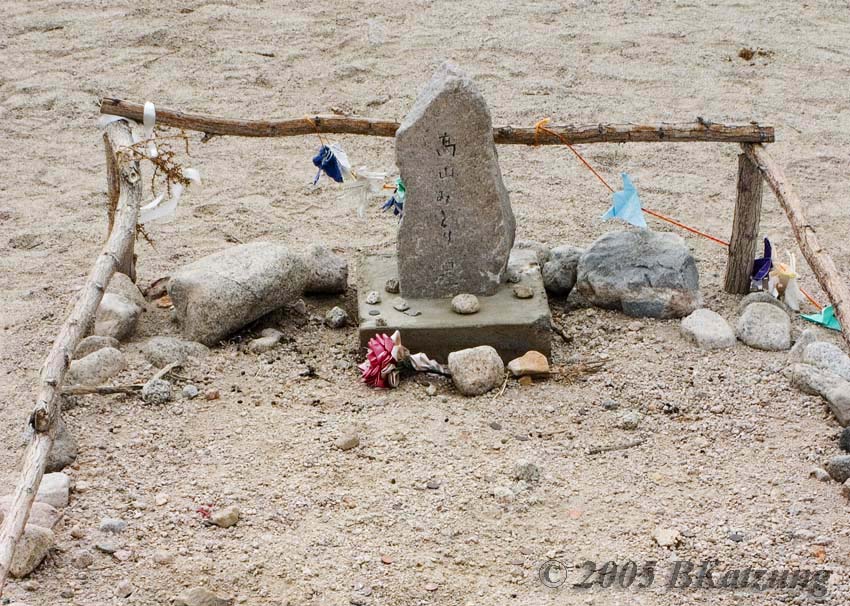 One of the few remaining graves in the cemetery. A few origami cranes are present.