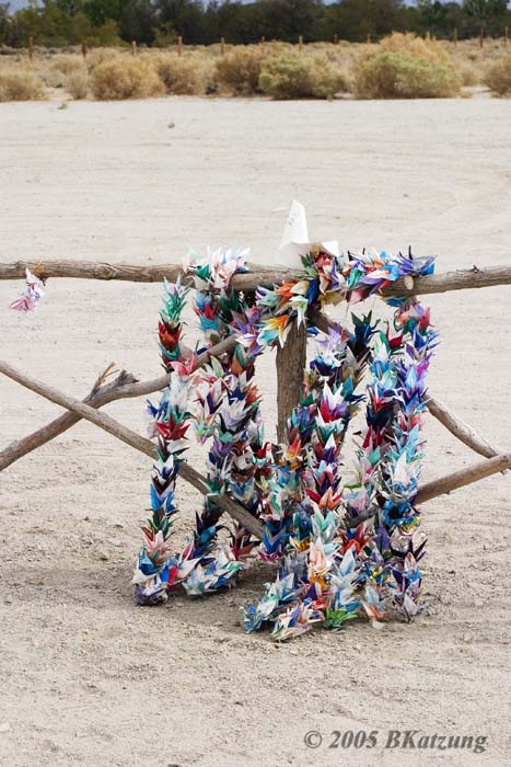 This obelisk stands in the cemetery and was photographed by Ansel Adams in 1943 as part of his series on the internment camp (http://www.loc.gov/rr/print/coll/109_anse.html). The inscription reads "Monument to console the souls of the dead." Another inscription on the back reads "Erected by the Manzanar Japanese August 1943." The eastern slope of the Sierra rises in the background. The steps of the obelisk are littered with "offerings" left by visitors: money, childrens' toys, flower vases, etc. The hints of color on the fence are chains of paper origami cranes, see below. Although over one hundred of the elderly died while interned, most of the remains were moved after the war and only one or two graves remain.