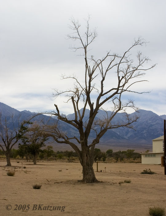 This stark tree stands near the Park Services building (right) and the main parking lot. It expressed my mood in seeing this place. Manzanar was formerly a large ranch and lies in a high valley, hot in summer and cold in winter, on the eastern side of the Sierra near Bishop, California.