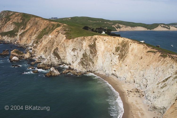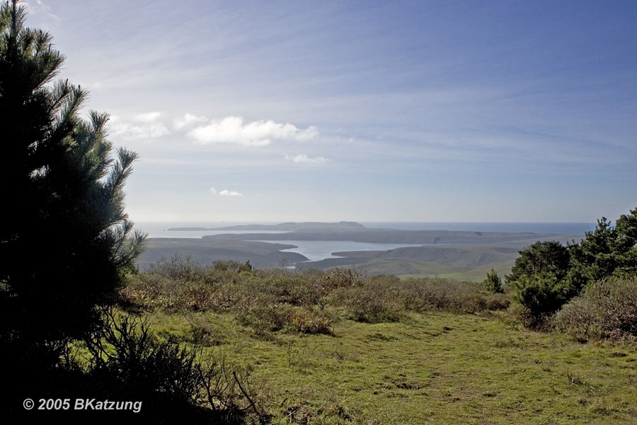 Above: The ocean on the left, with the sea lion cove on the left of the ridge, and Drakes Bay on the right.