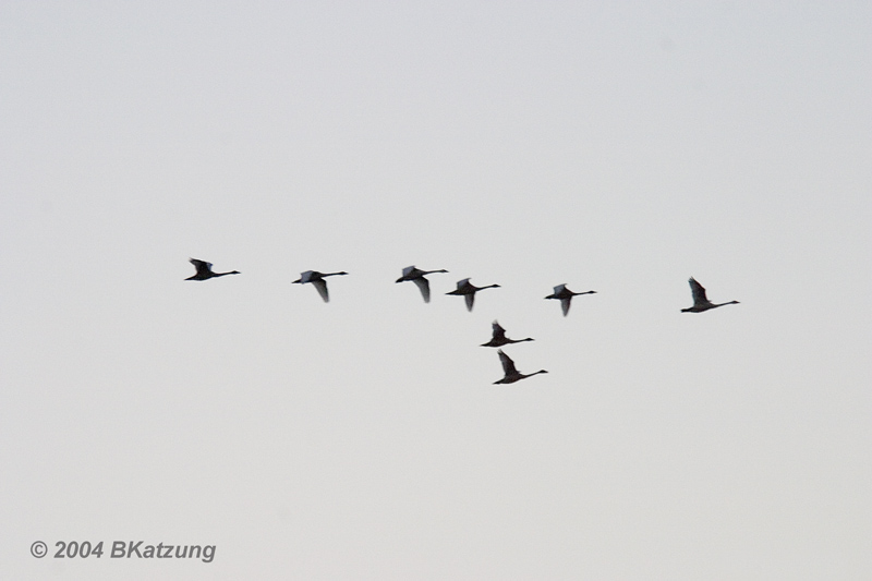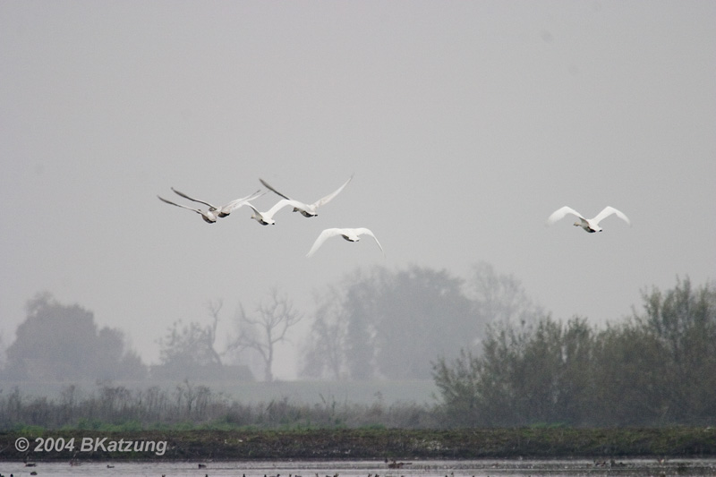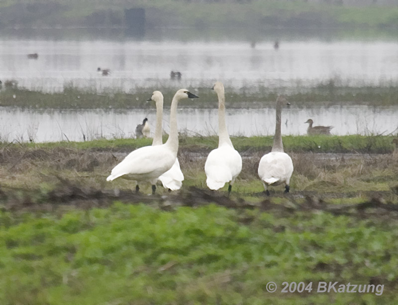 Tundra Swans (Cygnus columbianus) These swans (three mature and one grayish immature) were about to enter the water when we saw them on a dark and foggy afternoon. According to Sibley, the tundra swan is our smallest swan but larger than any goose. Their necks are clearly longer than those of geese and their black beaks also distinguish them from snow geese. Scroll down for more images.