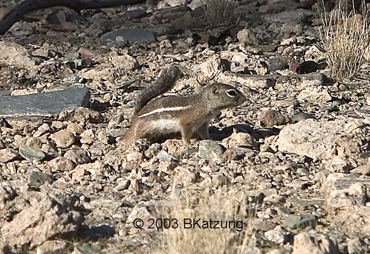 The Harris antelope squirrel is very common in the Phoenix area of Arizona. A colony of them lived in a 1-acre plot of scrub beyond the house where we stayed in November 2003. California Ground Squirrel (Spermophilus beecheyi)