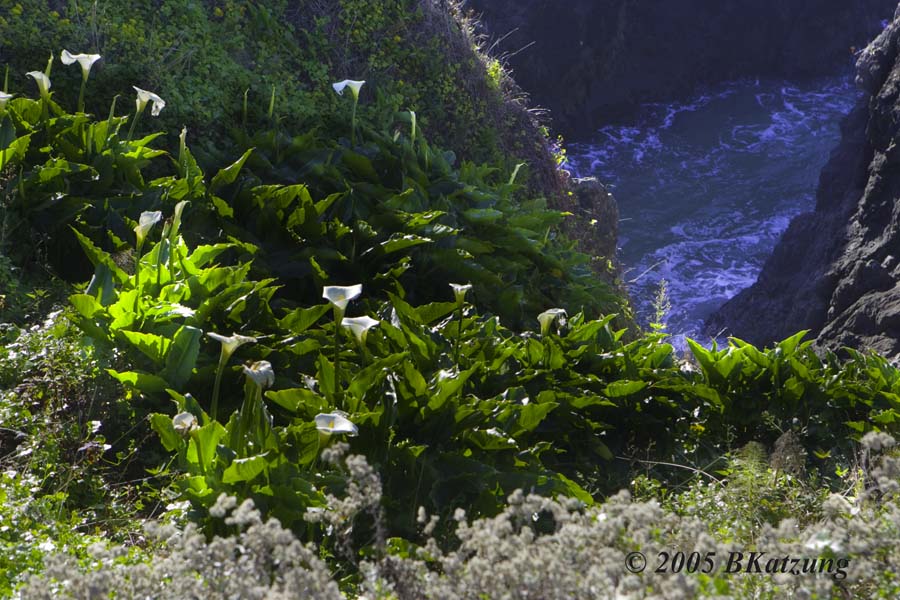 Looking down through cala lilies at an inlet.