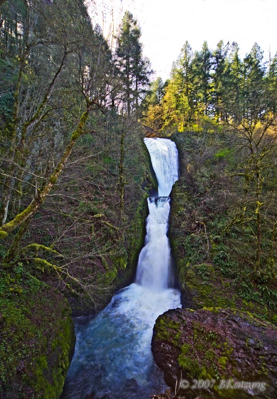 Multnomah Falls Imaged with my Sigma 12-24mm wide-angle at 15 mm. This is an 4-frame HDR image (PS CS2 version) and the people on the bridge have been erased by the HDR procedure. The north-facing orientation of most of the falls emptying into the Columbia prevents much light from falling on the water.
