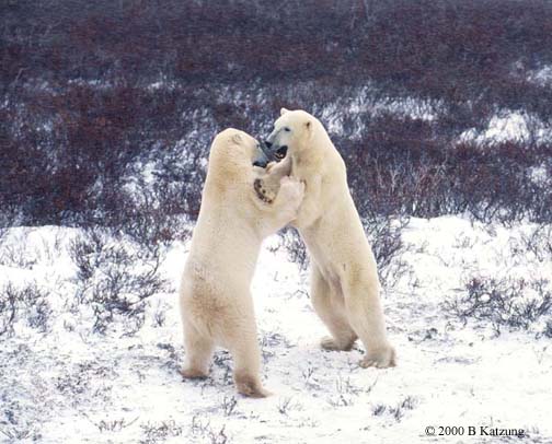These friendly competitors are just practicing. The serious stuff doesn't begin till much later, out on the ice, when they start competing over food (seals) and access to mating females. During these last few days of fall (it's still a warm 0 to 25 F), young males while away the time by sparring while waiting for the ice to freeze on the bay. They ignore the nearby tundra bunkhouse filled with people taking pictures. |