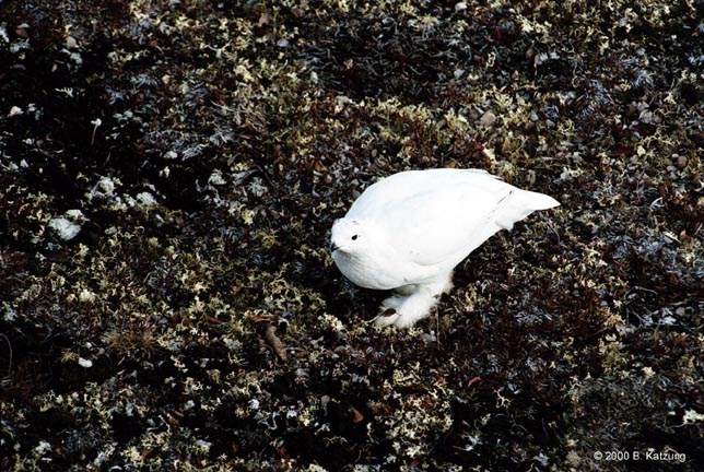 By far the most common animal we saw on our 1998 trip to Churchill. Often in flocks of 20 to 50 birds. They survive the subarctic winter by eating willow buds. Here, in the absence of snow, they have access to other food on the tundra. Note the feathered feet! The rock ptarmigan (Lagopus mutus) and willow ptarmigan (Lagopus lagopus) are members of the grouse family. They live in the high northern tundras of Alaska and Canada year-around. They are flocking birds who live on berries, seeds, and mosses in summer and willow buds and bark above the snow during the winter. Their feathered legs and feet permit them to survive in colder climates than most other birds; even their nostrils are covered by feathers. Males and females are similar in size (about 1–1.5 pounds) and coloring. Unlike most birds, ptarmigan undergo three molts per year, with color changes that (usually) maximize their camouflage. The bird shown, like the foxes, has changed to his winter coloration because the ground would ordinarily be snow-covered by this date (late October). In the high northern spring ptarmigan make nests by digging a hollow in the tundra and lining it with grasses, feathers, and bits of fur. Six to 12 eggs are laid and hatch in about 21 days. Rock ptarmigan chicks are ready to fly about 15-16 days after hatching, willow ptarmigan chicks as early as 7 days.